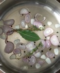 - Add the wine, shallots, garlic, peppercorns, bay leaf, and sprigs of thyme into a straight-sided, shallow sauce or frying pan (top row left photo), bring to a simmer, cook until it is “just dry” or in culinary terms “au sec”, which means “just dry” (top row right photo).
