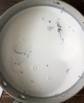 - Strain the half and half into a medium saucepan (2nd row center photo), return to a simmer.