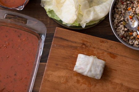 Miz and steps for making stuffed cabbage rolls in red sauce lr-7874 Posted by whatscookingatrays on March 28, 2017